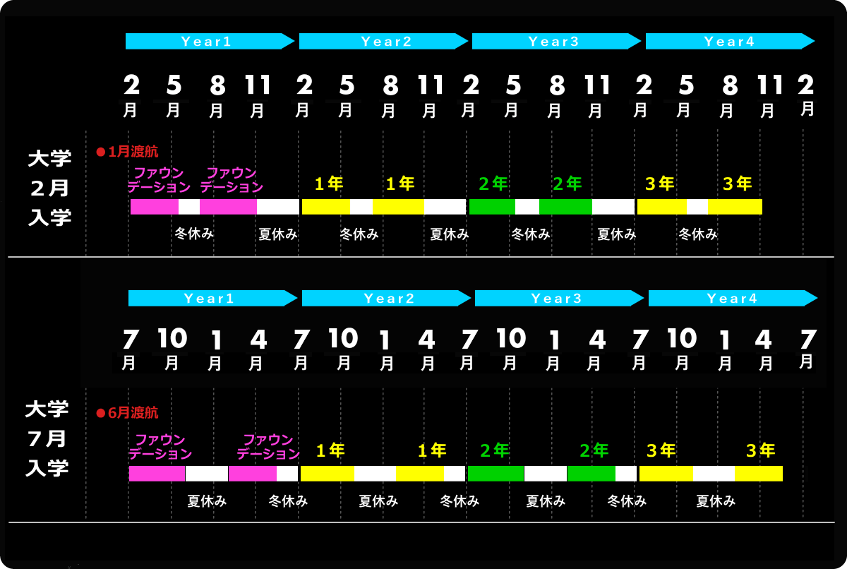 ※NZの大学は、入学から3年で卒業。ただし入学する前に、日本の高校卒業時の学生はファウンデーションコースに通う必要あり。